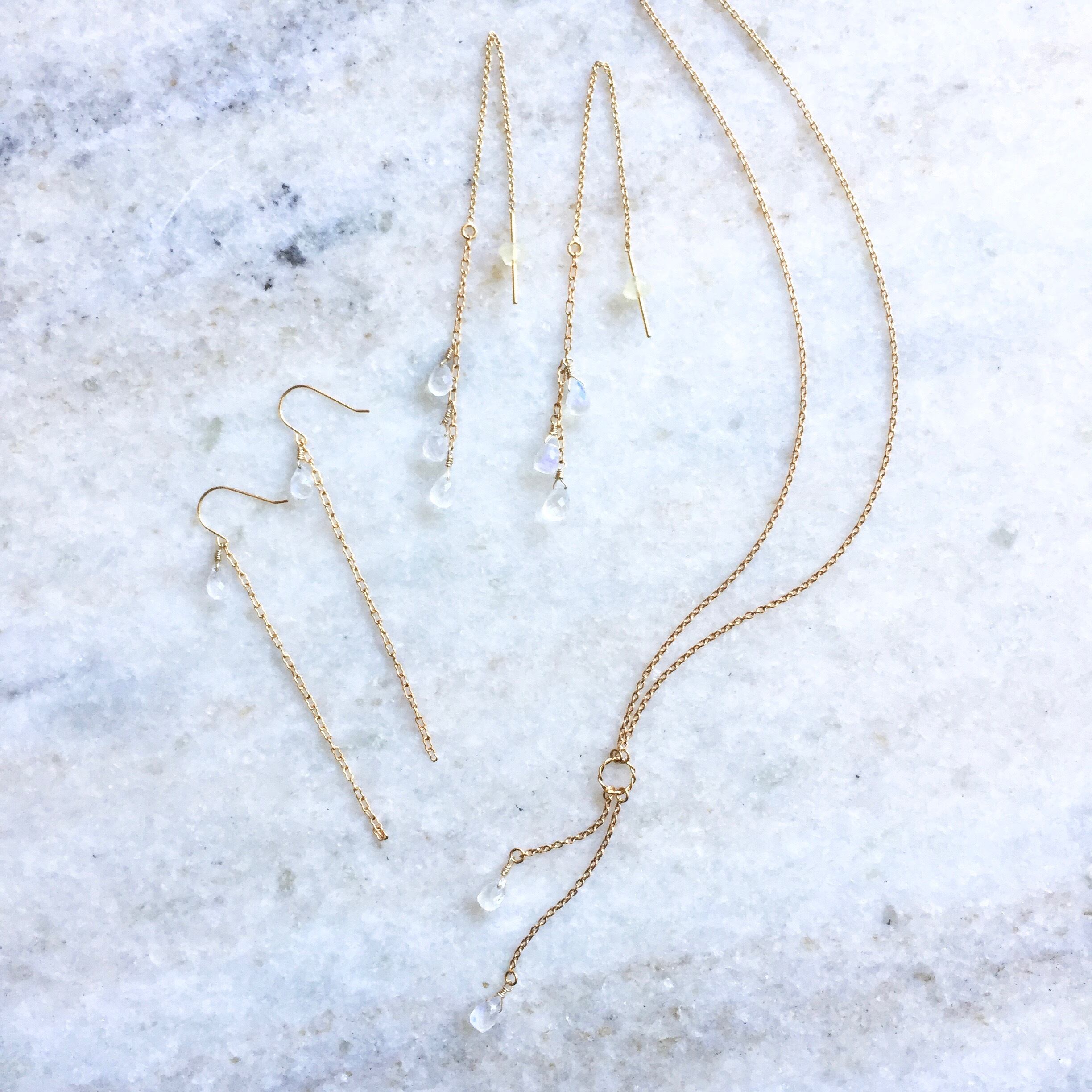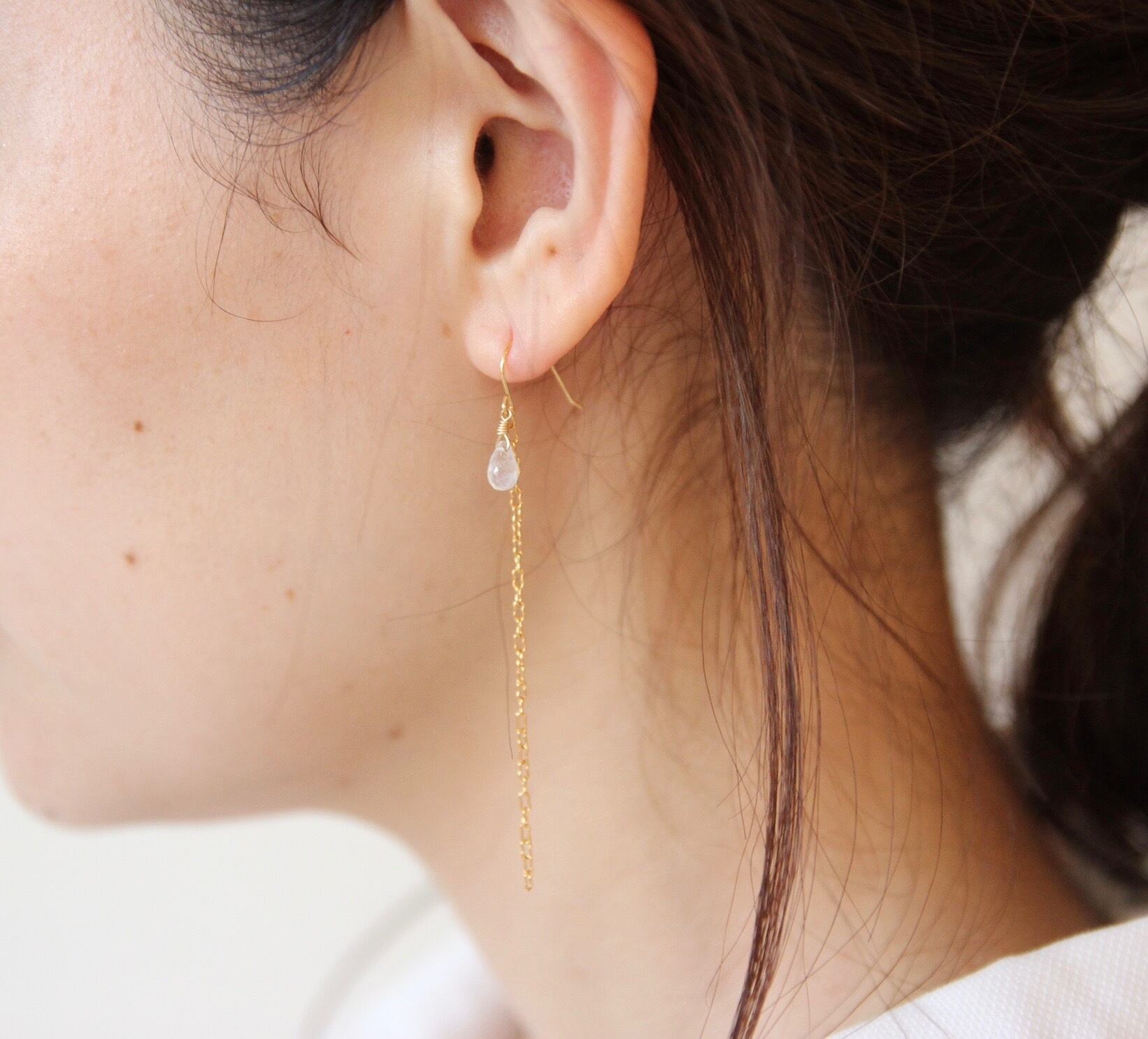 ブルームーンストーンとロングチェーンが揺れるフックタイプピアスです。